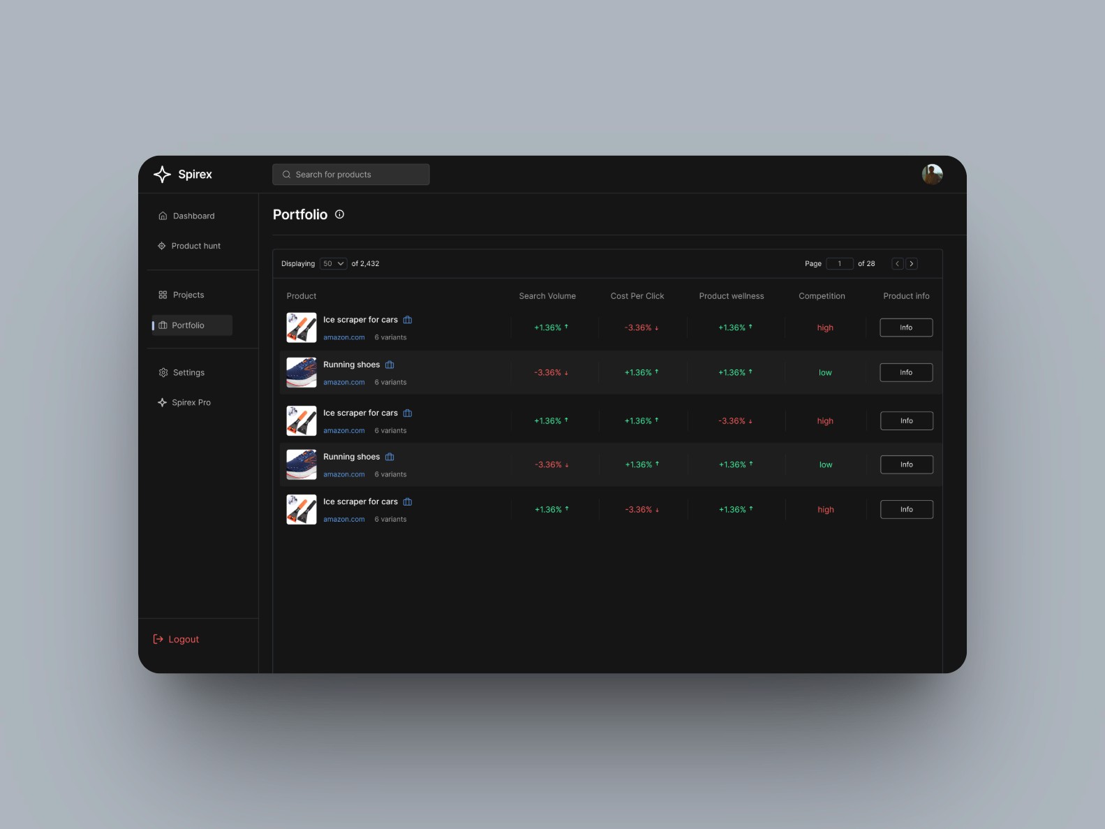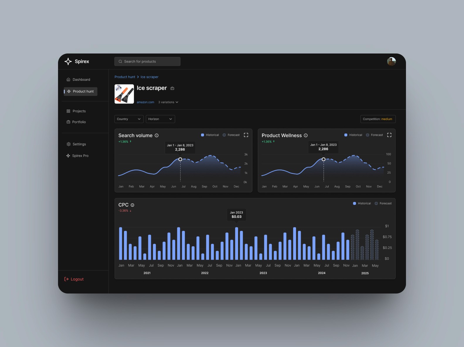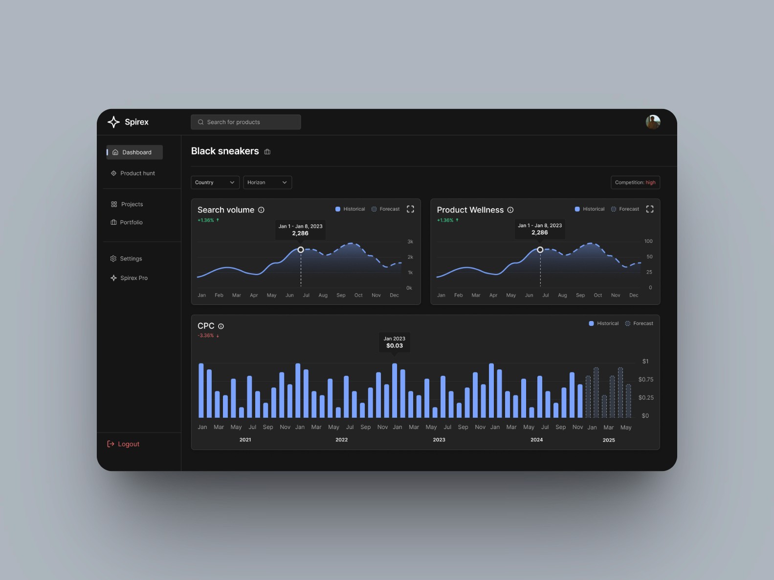 By forecasting key metrics like sales, search volume, cost per click (CPC), and competition rate, Spirex enables merchants to make informed decisions, without needing data analytics knowledge.