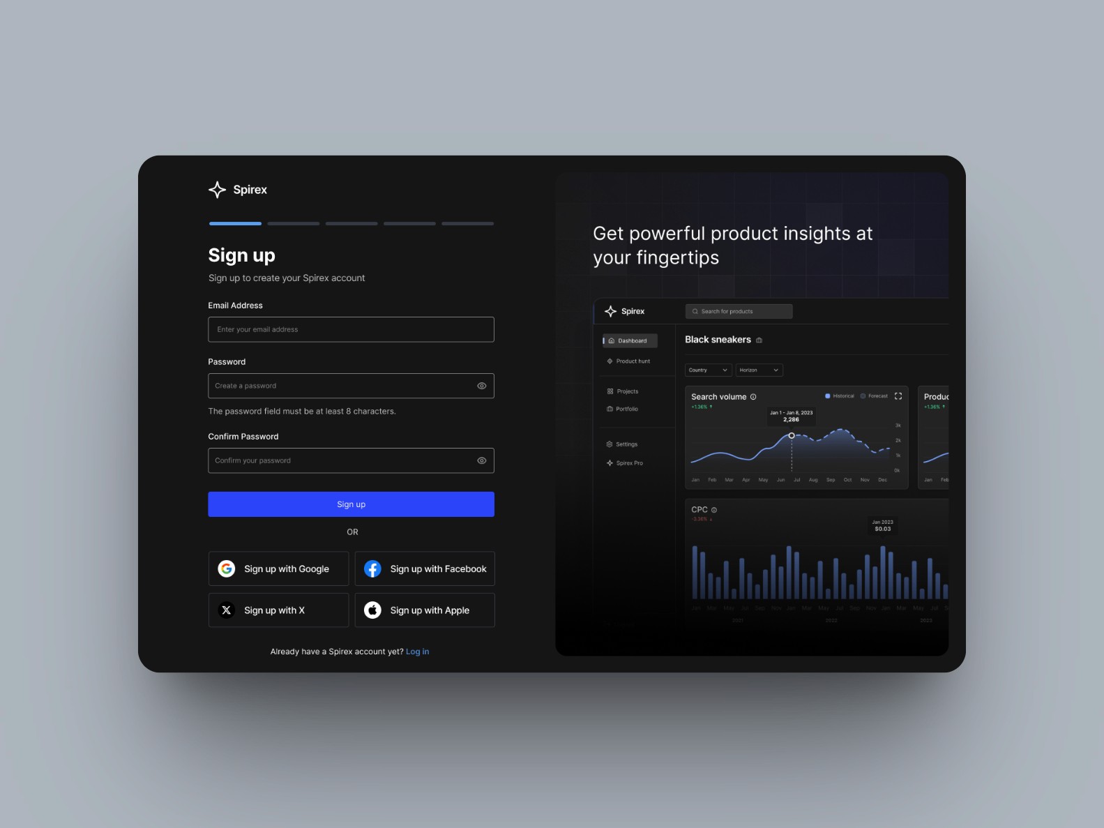 The e-commerce space is fast-moving, competitive, and increasingly data-driven, but most small founders don’t have the time or resources to crunch numbers. Spirex is tapping into that gap by helping merchants forecast product demand without needing a background in data analytics. With no strong design foundation in place, I partnered directly with the founder to simplify the experience, improve usability, and build a cohesive visual direction that’s accessible and scalable.
