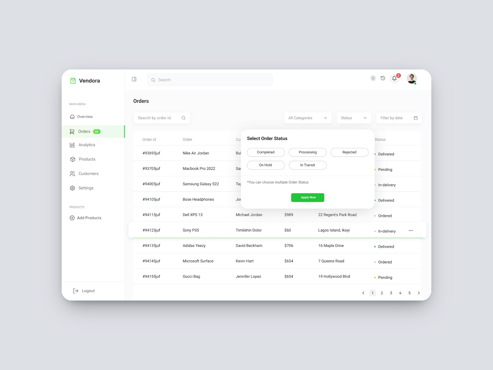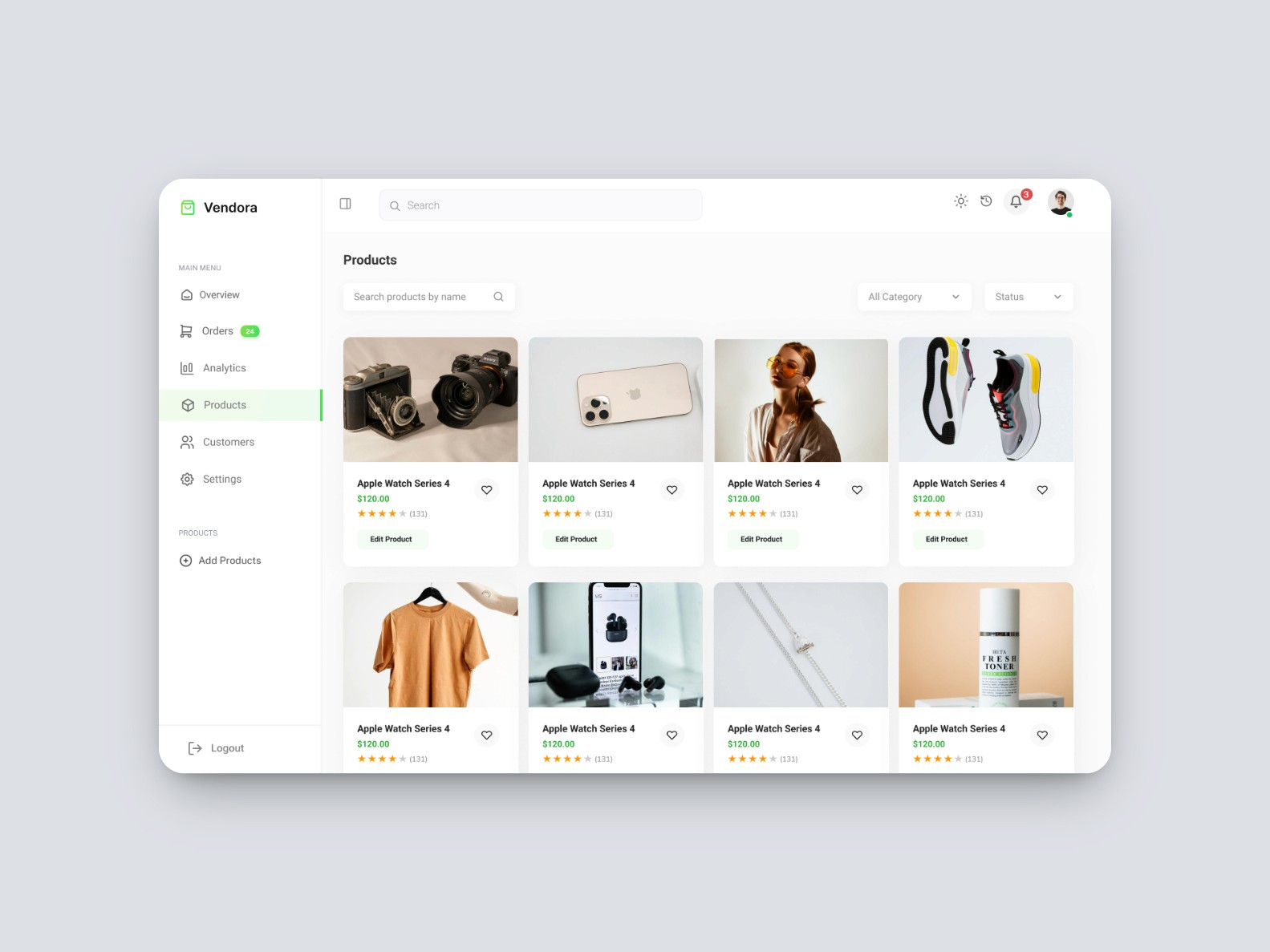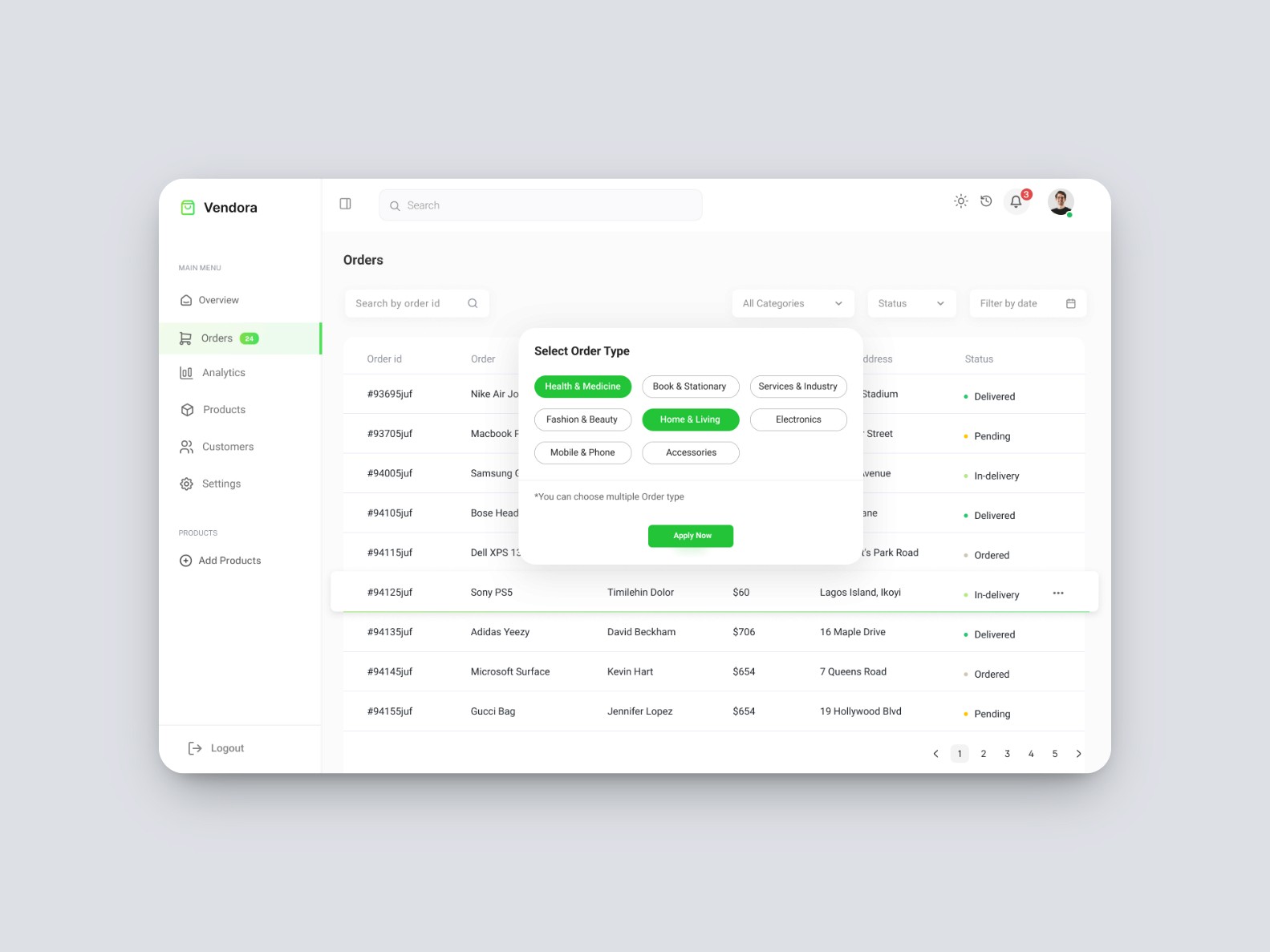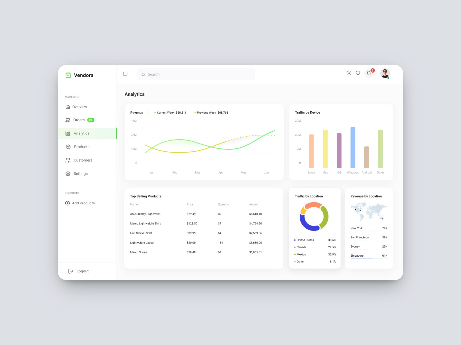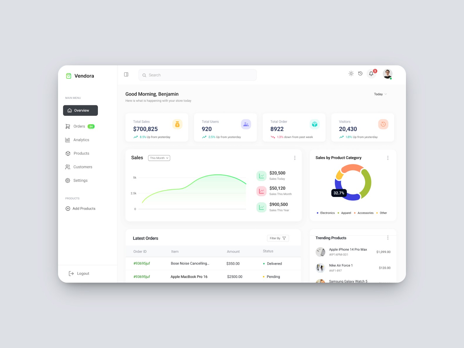 Vendora is a dashboard concept designed to streamline ecommerce operations for growing online businesses. The goal was to create a clean, intuitive interface that empowers store owners to manage orders, monitor sales, and update inventory effortlessly. With a focus on clarity and performance, the design offers a snapshot of the business at a glance, making day-to-day management faster and more efficient.