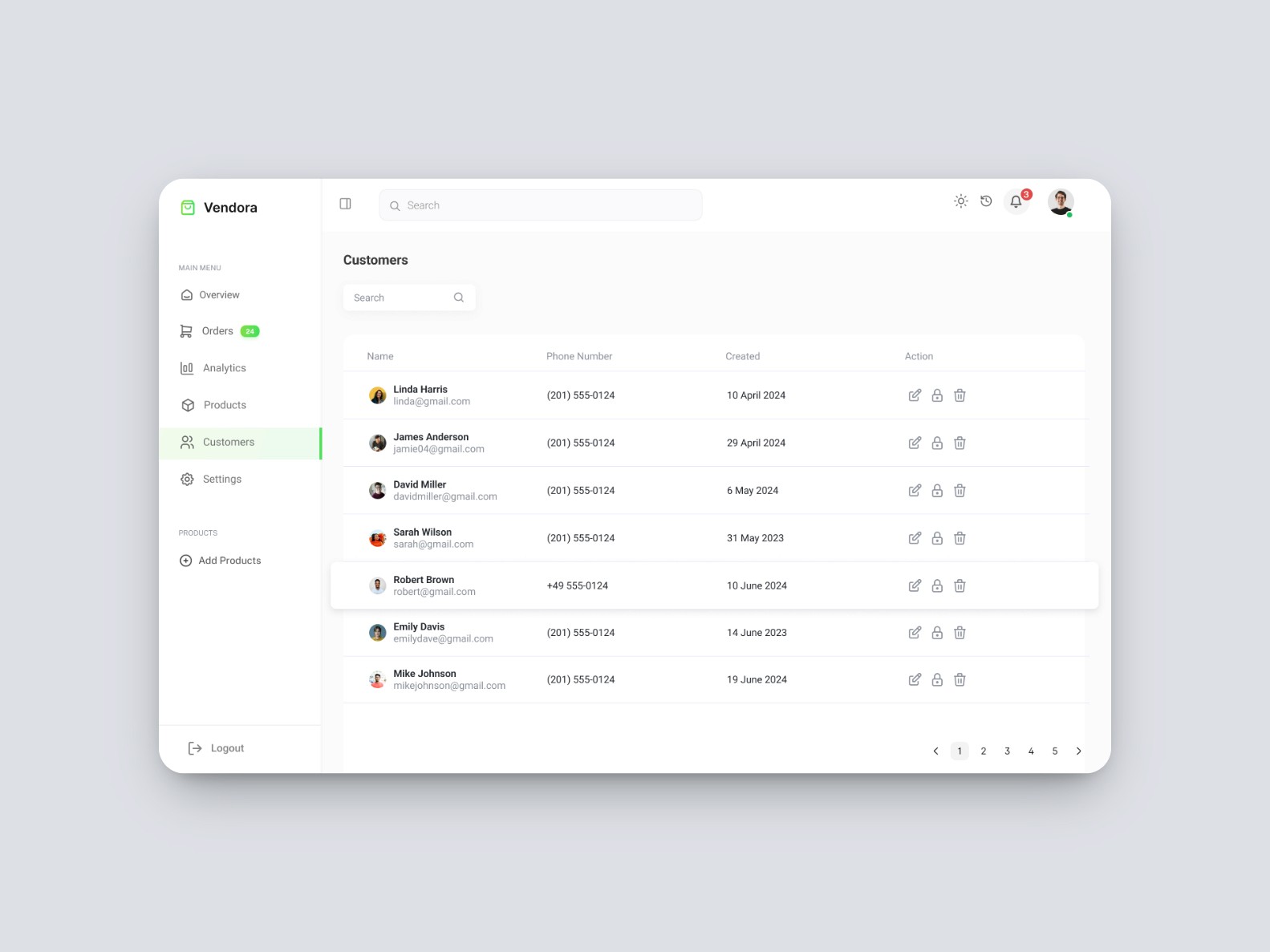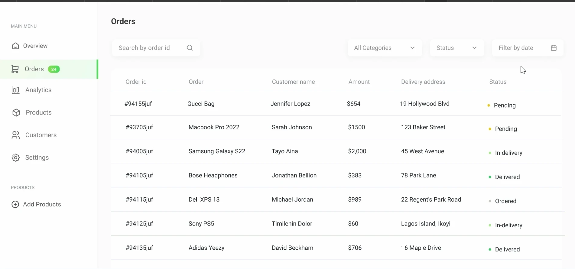 I applied a modern design system with reusable components. Each section; Orders, Customers, Products, was optimized for clarity, with hover states, filters, and responsive layouts.Design System & Consistency