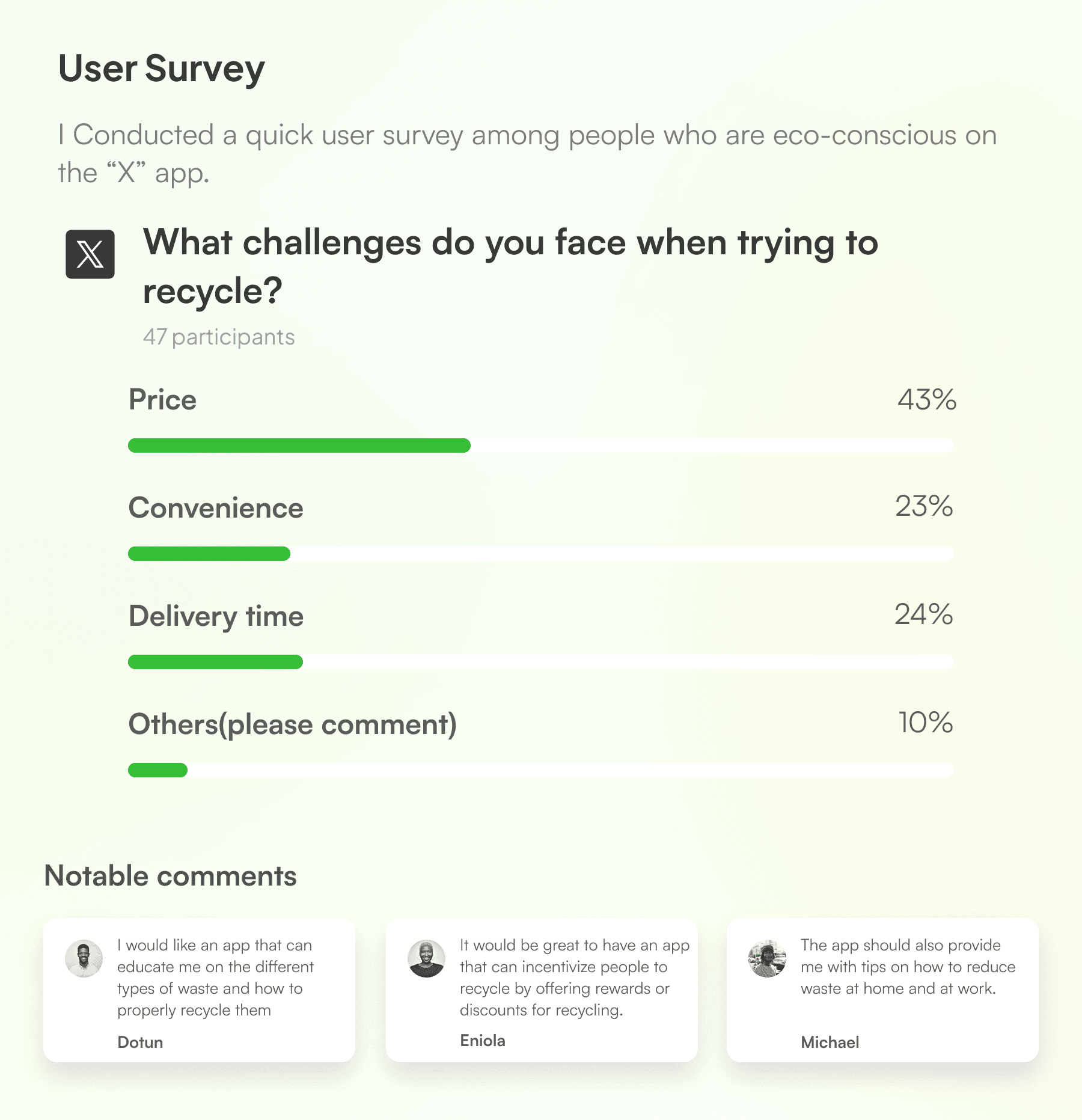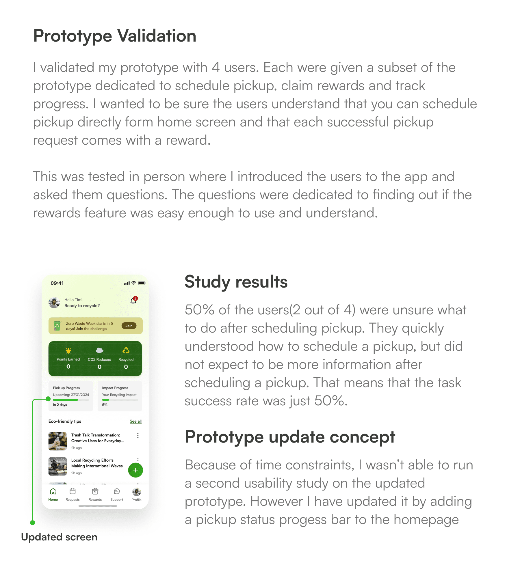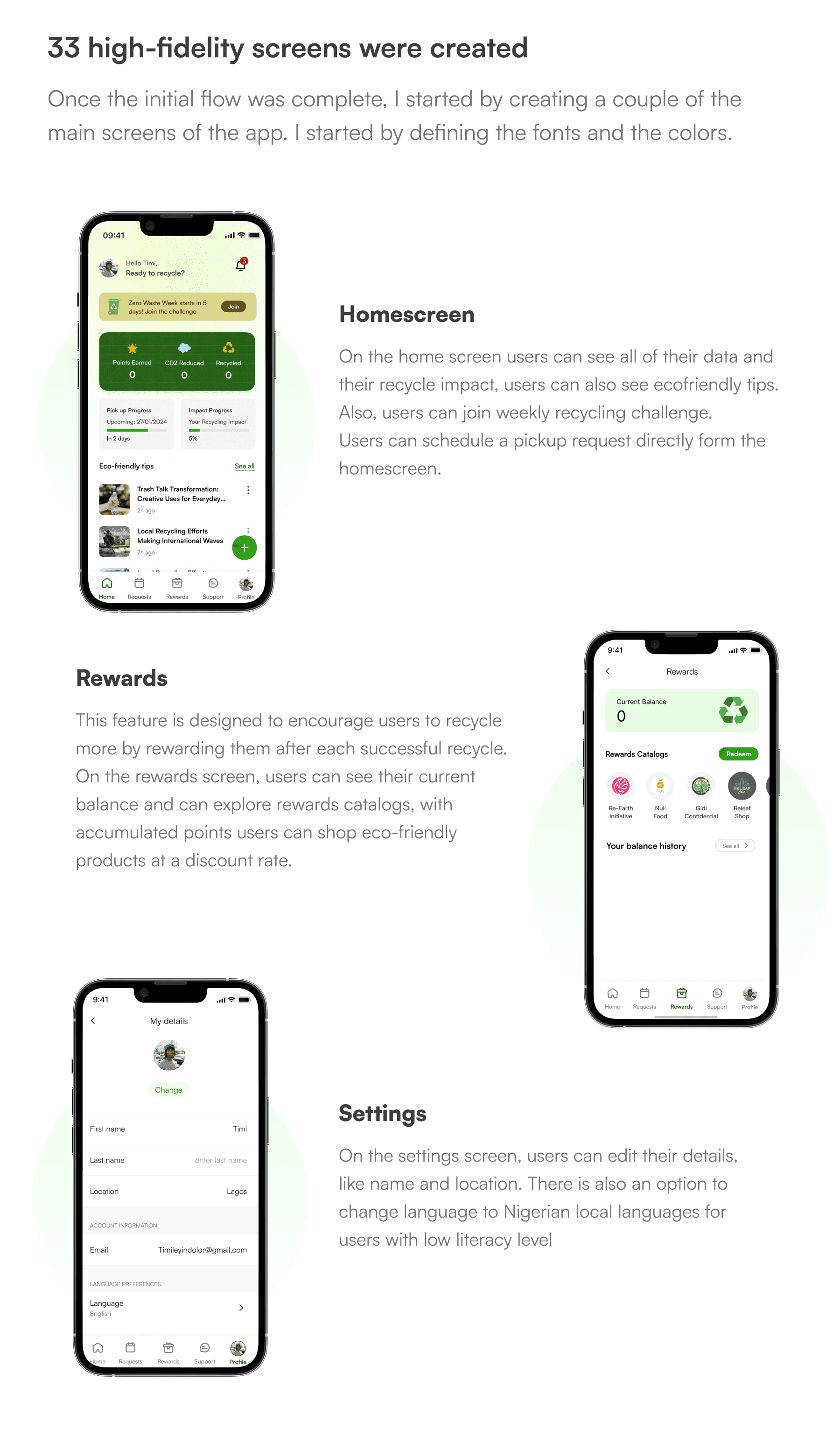 As a big fan of environmental sustainability, I created an app that educates and encourages users to recycle. This app will help save the environment by educating people and incentivising them, with different rewards and bonuses, to take action.